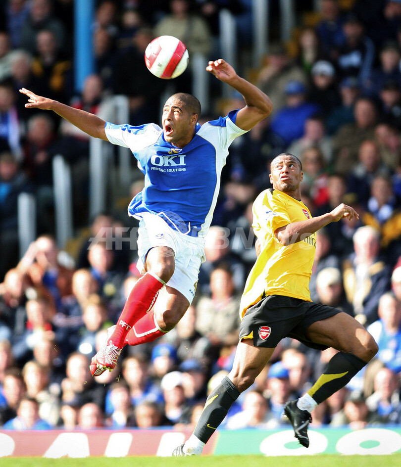 【ポーツマス/英国 13日 AFP】サッカー、イングランド・プレミアリーグ・最終第38節、ポーツマス(Portsmouth)vsアーセナル(Arsenal)。試合はスコアレスドローに終わり、ポーツマスは9位で今季のリーグ戦を終えた。写真は、アーセナルのジュリオ・バプティスタ(Julio Baptista、右)の目前でヘディングをするポーツマスのグレン・ジョンソン(Glen Johnson)。(c)AFP/ADRIAN DENNIS