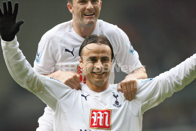 【ロンドン 13日 AFP】サッカー、イングランド・プレミアリーグ・最終第38節、トッテナム・ホットスパー(Tottenham Hotspur)vsマンチェスター・シティ(Manchester City)。トッテナムのディミタール・ベルバトフ(Dimitar Berbatov)は、前半32分にチーム2得点目を決めてシーズン12ゴール目をマーク。試合はトッテナムが2-1で勝利し、勝ち点を60に伸ばして5位でシーズンを終え07-08シーズンのUEFA杯(UEFA Cup)出場権を獲得した。写真は、ゴールに歓喜するベルバトフ。(c)AFP/BERTRAND LANGLOIS