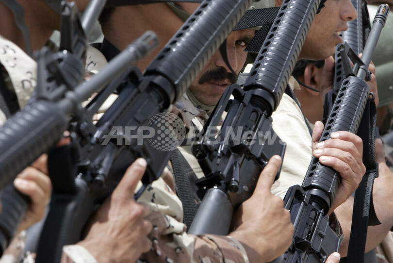 写真は13日、イラクのバグダッド北部にある米軍基地Camp Tajiで、米軍によって支給された新品のライフルを構えるイラク軍兵士たち。(c)AFP/CEERWAN AZIZ