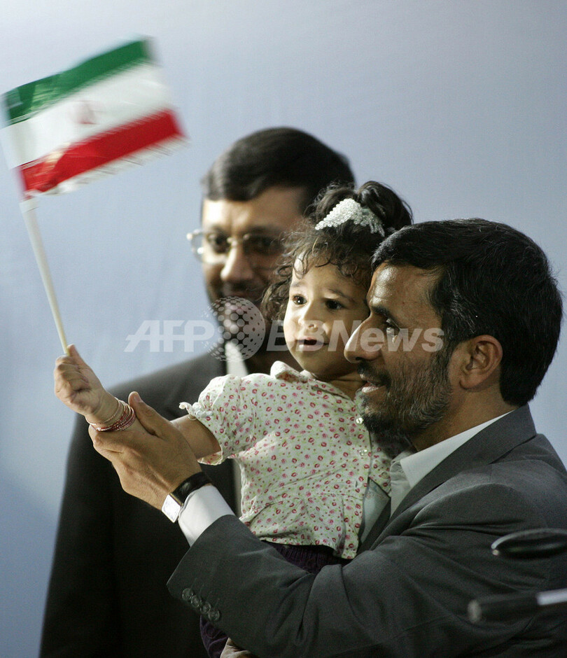 人々は、黒字に黄色の円が描かれた原子力を表すマークの旗を振り、「われわれは核エネルギーを手にする資格がある」とのスローガンを叫んで大統領を迎えた。写真は同日、少女を抱き上げ、集まった人々にイラン国旗を振るアフマディネジャド大統領。(c)AFP/KARIM SAHIB