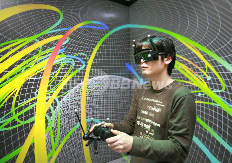写真は10日、JAMSTEC横浜研究所で、特殊なゴーグルを着用し、3 x 3 x 3 メートルのバーチャル・リアリティールームに投影した地球内部の液体金属の動きの3次元画像を見る同研究所地球シミュレータセンターの大野暢亮(Nobuaki Ohno)研究員。(c)AFP/Yoshikazu TSUNO