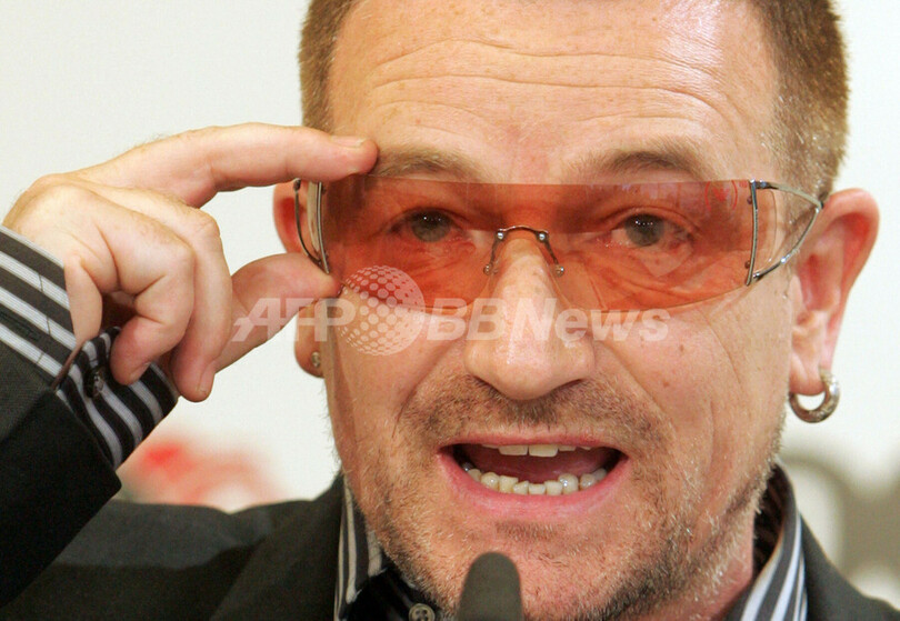 【ベルリン 15日 AFP】6月に開催される主要8か国(G8)サミットを控えた15日、国際NGO「DATA(Debt、AIDS、Trade、Africa)」が2007年の報告書を発表した。記者会見では、アイルランド出身のミュージシャン、ロックバンドU2のボーカルのボノ(Bono)とロック歌手ボブ・ゲルドフ(Bob Geldof)が、アフリカ援助の公約を守らなかったとしてドイツを非難し、アンゲラ・メルケル(Angela Merkel)首相の道義的責任を追求した。写真は同日、貴社会見に出席したボノ。(c)AFP/JOHN MACDOUGALL