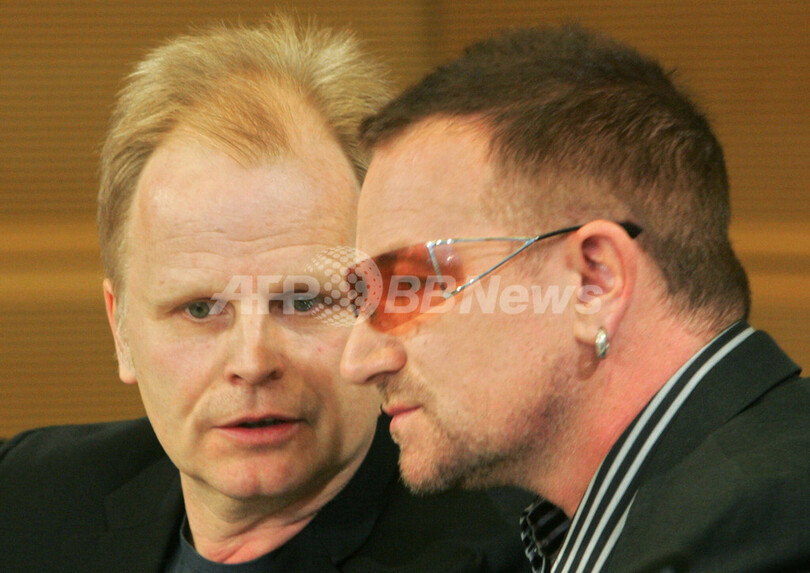 【ベルリン 15日 AFP】6月に開催される主要8か国(G8)サミットを控えた15日、国際NGO「DATA(Debt、AIDS、Trade、Africa)」が2007年の報告書を発表した。記者会見では、アイルランド出身のミュージシャン、ロックバンドU2のボーカルのボノ(Bono)とロック歌手ボブ・ゲルドフ(Bob Geldof)が、アフリカ援助の公約を守らなかったとしてドイツを非難し、アンゲラ・メルケル(Angela Merkel)首相の道義的責任を追求した。写真は同日、貴社会見に出席したボノ。(c)AFP/JOHN MACDOUGALL