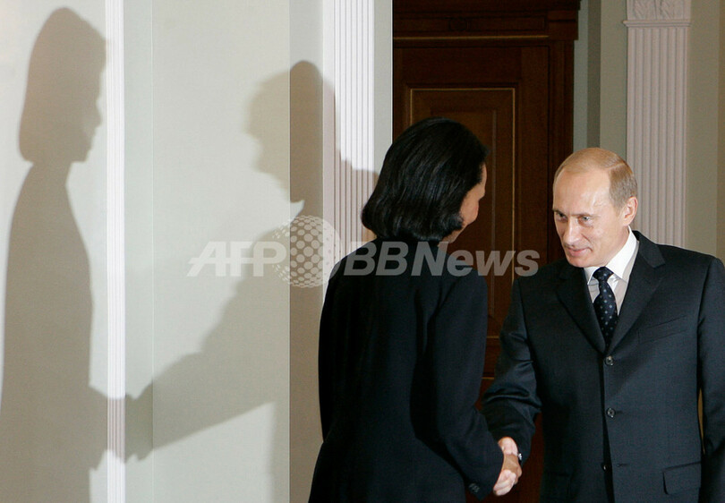 写真は握手を交わすライス長官とプーチン大統領(モスクワ、2006年10月21日撮影)。(c)AFP/PRESIDENTIAL PRESS SERVICE/ITAR-TASS