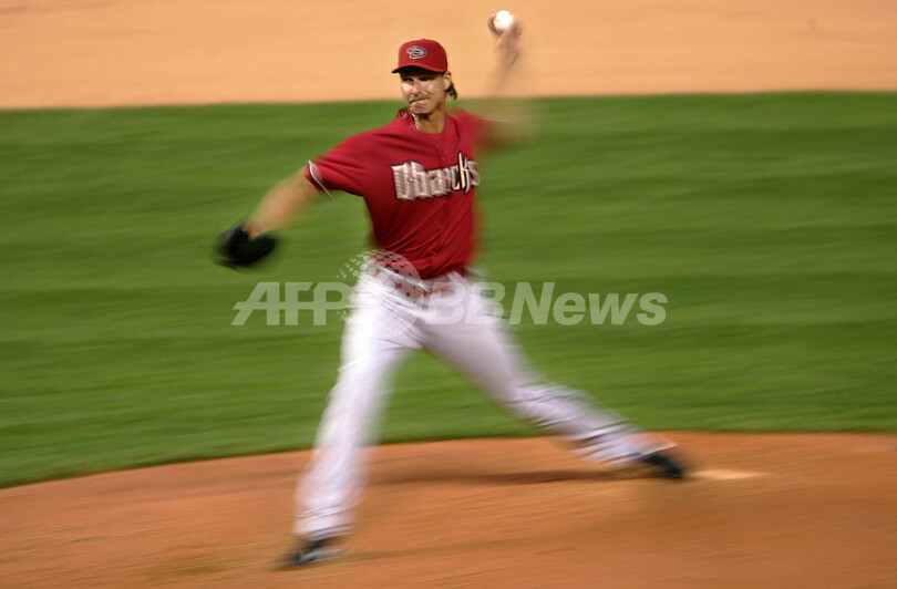 【デンバー/米国 15日 AFP】07MLB、コロラド・ロッキーズ(Colorado Rockies)vsアリゾナ・ダイヤモンドバックス(Arizona Diamondbacks)。ダイヤモンドバックスの先発ランディ・ジョンソン(Randy Johnson)は、6回を投げ1安打無失点9奪三振と見事な投球を見せ、移籍後初勝利を飾った。試合はダイヤモンドバックスが3-0でロッキーズを降し連敗を2で止めた。(c)AFP/Getty Images Doug Pensinger