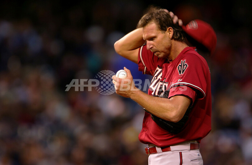 【デンバー/米国 15日 AFP】07MLB、コロラド・ロッキーズ(Colorado Rockies)vsアリゾナ・ダイヤモンドバックス(Arizona Diamondbacks)。ダイヤモンドバックスの先発ランディ・ジョンソン(Randy Johnson)は、6回を投げ1安打無失点9奪三振と見事な投球を見せ、移籍後初勝利を飾った。試合はダイヤモンドバックスが3-0でロッキーズを降し連敗を2で止めた。(c)AFP/Getty Images Doug Pensinger