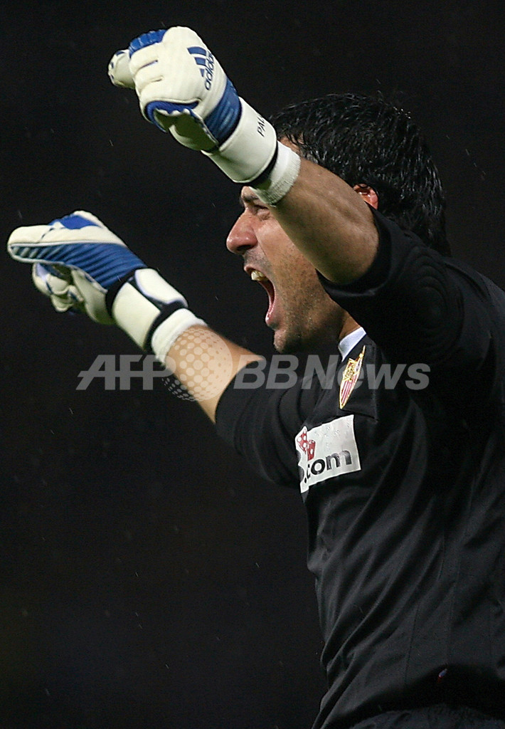 【グラスゴー/英国 16日 AFP】サッカー、UEFA杯(UEFA Cup)・決勝、セビージャ(Sevilla)vsエスパニョール(Espanyol)。試合は1-1で迎えた延長でも両チーム共に1点づつを取り合い決着が着かず、PK戦の末GKアンドレス・パロップ(Andres Palop)が3本の好セーブを見せたセビージャが3-1で勝利し、大会連覇を達成した。写真は、チームメイトの得点を喜ぶパロップ。(c)AFP/JOSE LUIS ROCA