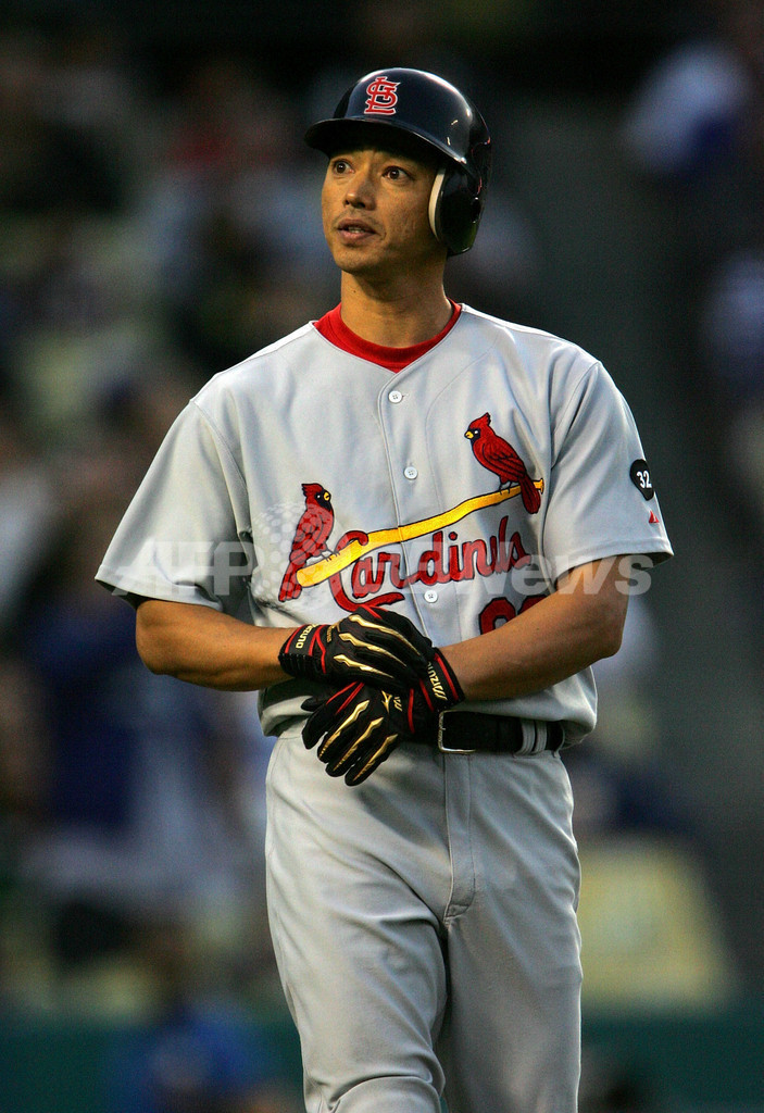 【ロサンゼルス/米国 16日 AFP】07MLB、ロサンゼルス・ドジャース(Los Angeles Dodgers)vsセントルイス・カージナルス(St. Louis Cardinals)。カージナルスの田口壮(So Taguchi)は、7番・中堅で4試合振りの先発出場を果たすも、4打数無安打2三振に終わった。試合はカージナルスが4-5でドジャースに敗れ、2連敗を喫した。(c)AFP/Getty Images Stephen Dunn
