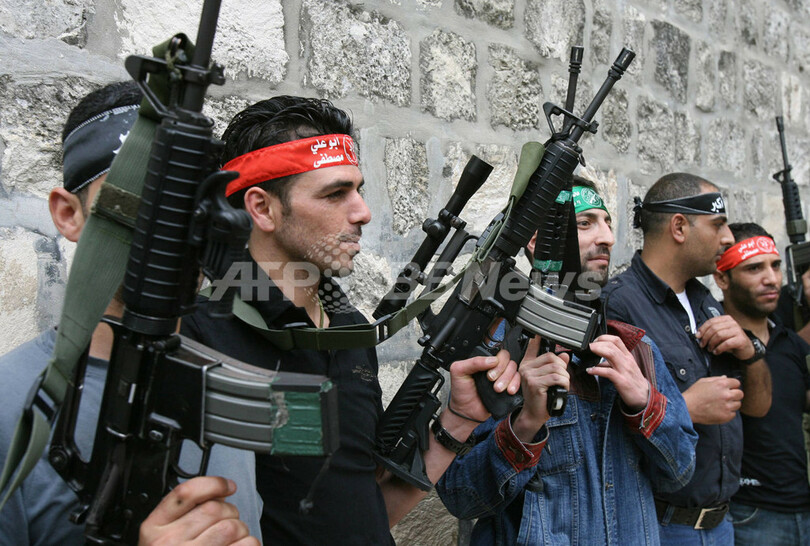 写真は17日、ヨルダン川西岸(West Bank)北部のナブルス(Nablus)に集まったパレスチナの各派閥の戦闘員たち。共同記者会見を開き、パレスチナ人の団結を訴えた。(c)AFP/JAAFAR ASHTIYEH