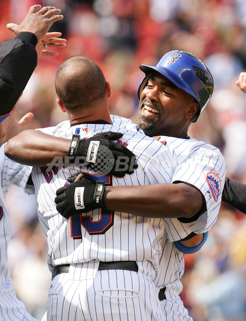 【ニューヨーク 17日 AFP】07MLB、ニューヨーク・メッツ(New York Mets)vsシカゴ・カブス(Chicago Cubs)。4番・一塁で先発出場したメッツのカルロス・デルガド(Carlos Delgado)は、9回裏に勝ち越しとなる2点タイムリー安打を放ち勝利に貢献。試合はメッツが9回裏に大量5点を奪い、6-5でカブスにサヨナラ勝ちを収めた。写真は、サヨナラ勝ちを決めてチームメイトのカルロス・ベルトラン(Carlos Beltran、左)と喜びを分かち合うデルガド。(c)AFP/Getty Images Al Bello