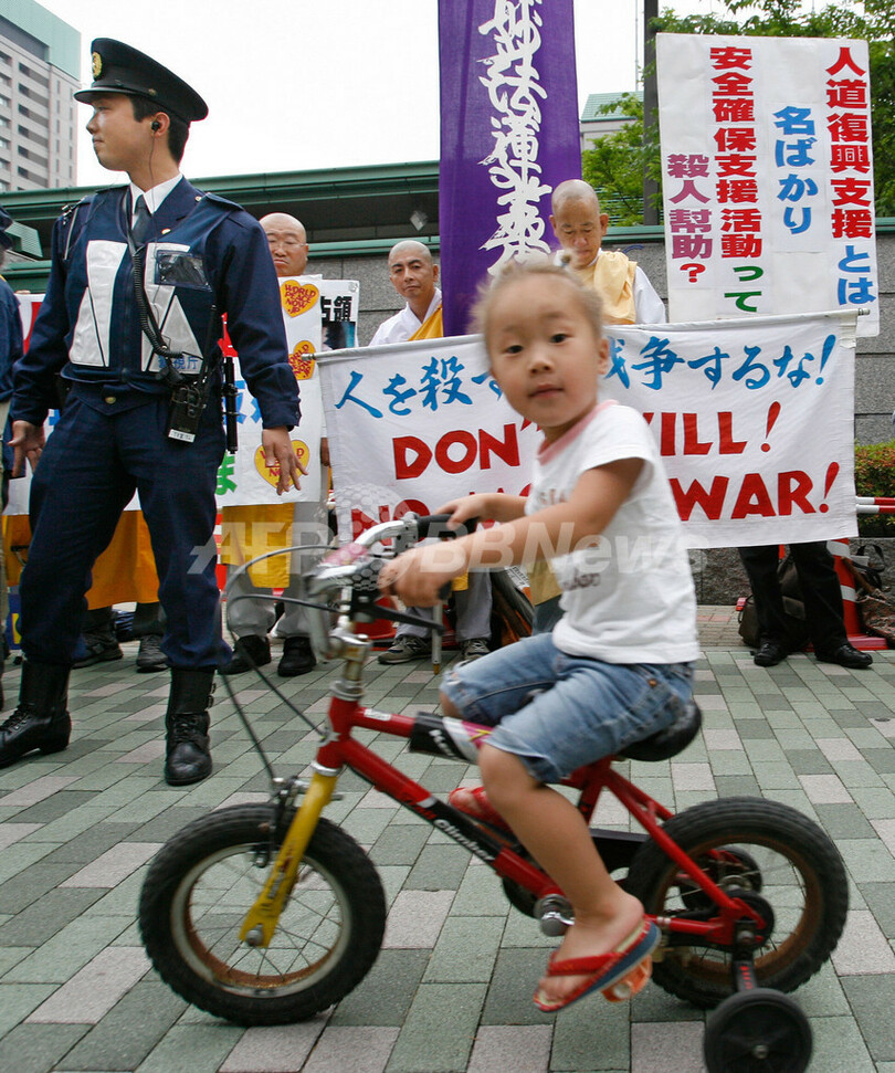 【東京 19日 AFP】航空自衛隊のイラク派遣を2年間延長する「イラク復興支援特別措置法改正案」に反対する平和活動家ら約100人が19日、東京の防衛省前で抗議活動を行った。この法案は15日に衆院本会議で可決され参院に送付され、今国会で成立する見通しとなっている。