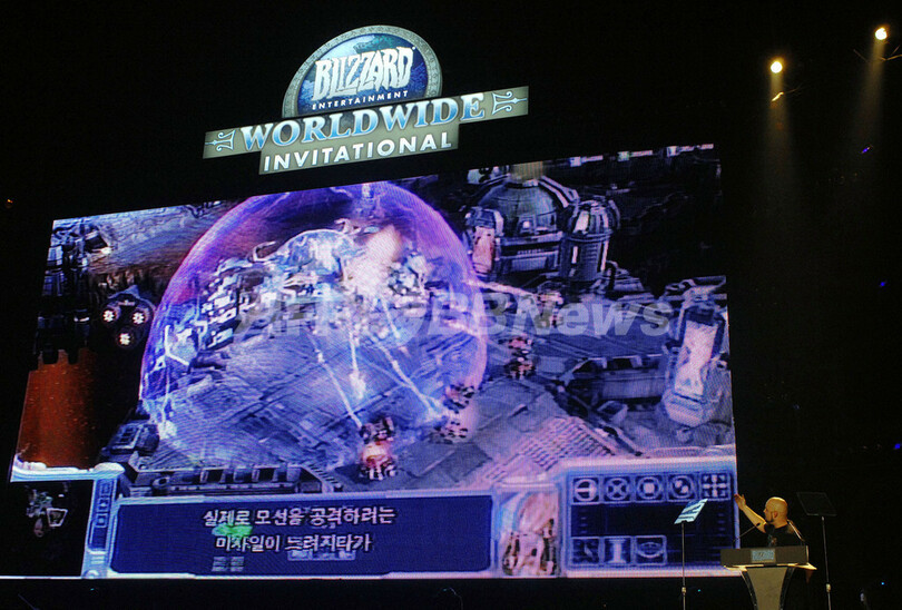 【ソウル 19日 AFP】米国のコンピューターゲーム製作・販売会社、ブリザード・エンターテインメント(Blizzard Entertainment)は19日、ソウルで新作ゲームの「スタークラフト2(StarCraft 2)」を発表した。新作は3Dとなり、「新種族」も追加、また既存の種族も大幅に修正されている。写真はゲームについて説明をするゲーム開発担当者、Dustin Browder氏(右下)。(c)AFP/JUNG YEON-JE