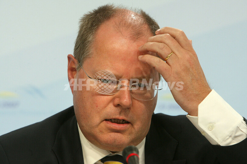写真は会合閉幕後、記者会見に臨むシュタインブリュック財務相。(c)AFP/JOHN MACDOUGALL