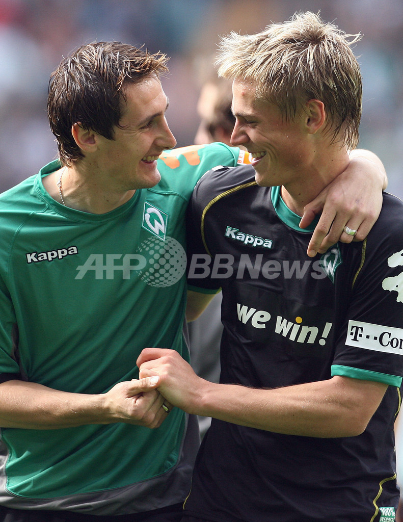 【ボルフスブルク/ドイツ 19日 AFP】サッカー、ドイツ・ブンデスリーガ・最終第34節、VfLボルフスブルク(VfL Wolfsburg)vsヴェルダー・ブレーメン(Werder Bremen)。ブレーメンのマルクス・ローゼンベリ(Markus Rosenberg)は、2得点(後半9分、42分)を挙げる活躍でチームを勝利に導いた。試合はブレーメンが2-0でボルフスブルクを降して最終戦を白星で飾り、欧州チャンピオンズリーグ(Champions League)出場圏内の3位で今季のリーグ戦を終えた。写真は、チームメイトのミロスラフ・クローゼ(Miroslav Klose、左)と共に勝利を喜ぶローゼンベリ。(c)AFP/DDP/MARCUS BRANDT