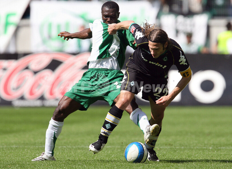 【ボルフスブルク/ドイツ 19日 AFP】サッカー、ドイツ・ブンデスリーガ・最終第34節、VfLボルフスブルク(VfL Wolfsburg)vsヴェルダー・ブレーメン(Werder Bremen)。ブレーメンのマルクス・ローゼンベリ(Markus Rosenberg)は、2得点(後半9分、42分)を挙げる活躍でチームを勝利に導いた。試合はブレーメンが2-0でボルフスブルクを降して最終戦を白星で飾り、欧州チャンピオンズリーグ(Champions League)出場圏内の3位で今季のリーグ戦を終えた。写真は、チームメイトのミロスラフ・クローゼ(Miroslav Klose、左)と共に勝利を喜ぶローゼンベリ。(c)AFP/DDP/MARCUS BRANDT