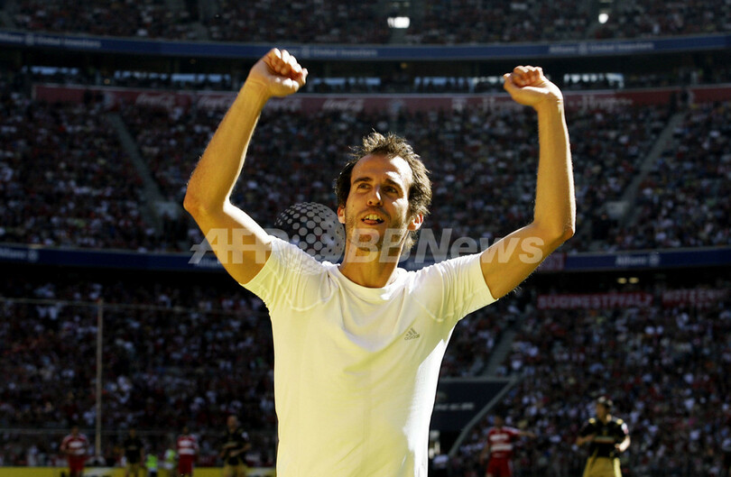 【ミュンヘン/ドイツ 19日 AFP】サッカー、ドイツ・ブンデスリーガ・最終第34節、バイエルン・ミュンヘン(Bayern Munich)vsマインツ05(Mainz 05)。今シーズン限りでの現役引退を表明しているバイエルンのメーメット・ショル(Mehmet Scholl)は、前半33分にチーム2得点目を決め今季初ゴールをマークし現役最後の試合に華を添えた。試合はバイエルンが5-2で快勝し、18勝10敗6分けの4位で今季のリーグ戦を終えた。写真は、試合後サポーターの歓声に応えるショル。(c)AFP/DDP/SASCHA SCHUERMANN