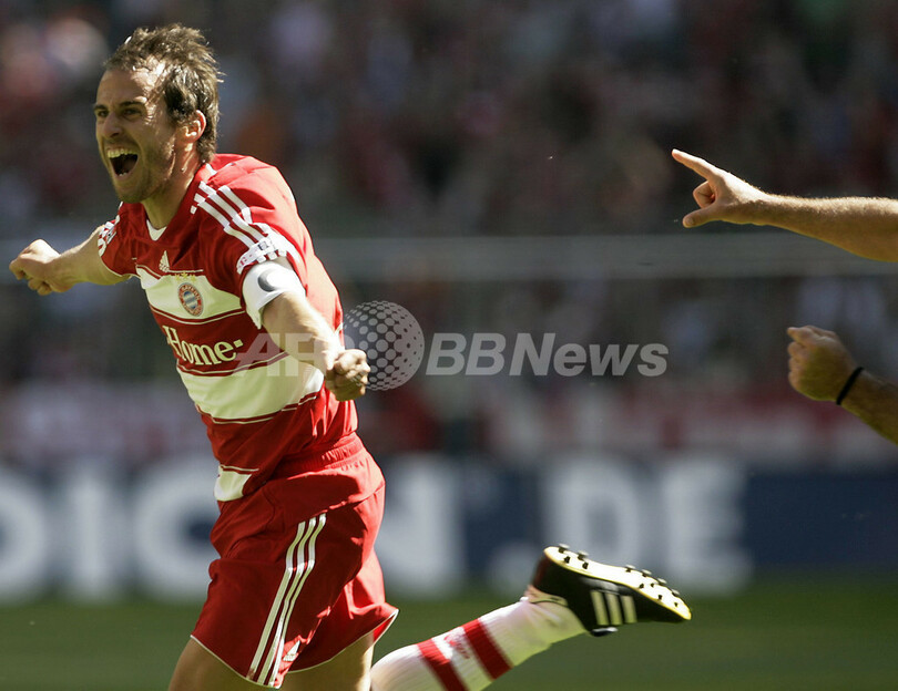 【ミュンヘン/ドイツ 19日 AFP】サッカー、ドイツ・ブンデスリーガ・最終第34節、バイエルン・ミュンヘン(Bayern Munich)vsマインツ05(Mainz 05)。今シーズン限りでの現役引退を表明しているバイエルンのメーメット・ショル(Mehmet Scholl)は、前半33分にチーム2得点目を決め今季初ゴールをマークし現役最後の試合に華を添えた。試合はバイエルンが5-2で快勝し、18勝10敗6分けの4位で今季のリーグ戦を終えた。写真は、試合後サポーターの歓声に応えるショル。(c)AFP/DDP/SASCHA SCHUERMANN