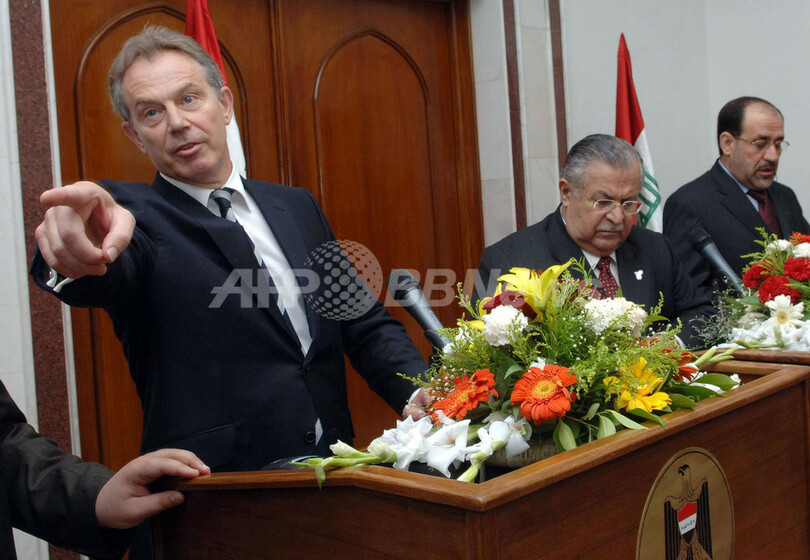 写真はマリキ首相(右)、タラバニ大統領(中央)とともに記者会見を行うブレア首相(左)。(c)AFP/WPA ROTA/Stefan Rousseau
