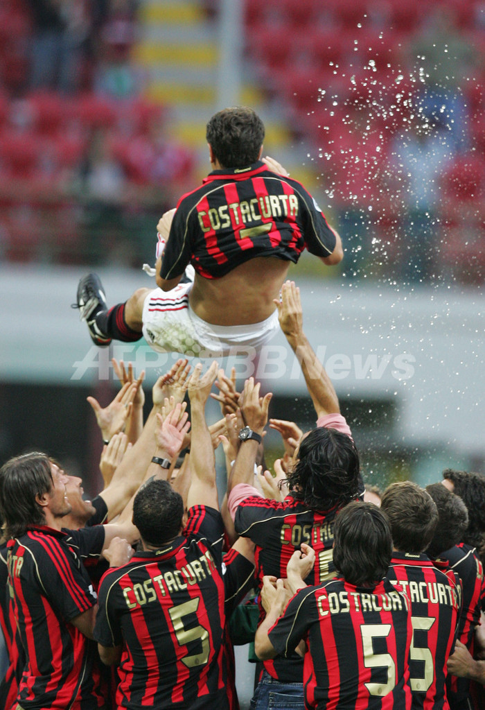 【ミラノ/イタリア 19日 AFP】サッカー、イタリア・セリエA・第37節、ACミラン(AC Milan)vsウディネーゼ(Udinese)。今季限りでの現役引退を表明しているミランのアレッサンドロ・コスタクルタ(Alessandro Costacurta)は、後半12分にPKでチーム2得点目を挙げリーグ戦では91-92シーズン以来のゴールをマークする。試合は23日に欧州チャンピオンズリーグ(Champions League)・決勝のリバプール(Liverpool)戦に向けて主力を温存したミランが2-3で敗れ、ホーム最終戦を白星で飾ることができなかった。(c)AFP/ANDREAS SOLARO