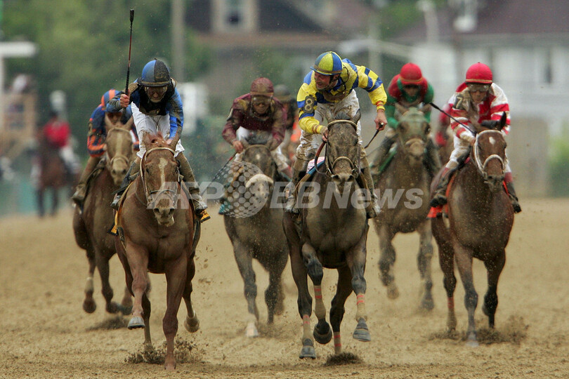 【ボルティモア/米国 19日 AFP】競馬、米国3冠レースの第2冠、第132回プリークネス・ステークス(132nd Preakness Stakes:米国G1)がピムリコ競馬場(Pimlico Race Course)の芝1と3/16マイル(約1900メートル)で3歳馬9頭が出走し、第133回ケンタッキーダービー(133rd Kentucky Derby)で3位に入賞したロビー・アルバラード(Robby Albarado)騎手が騎乗するカーリン(Curlin)が1分53秒46で優勝を飾った。(c)AFP/Getty Images Chris McGrath