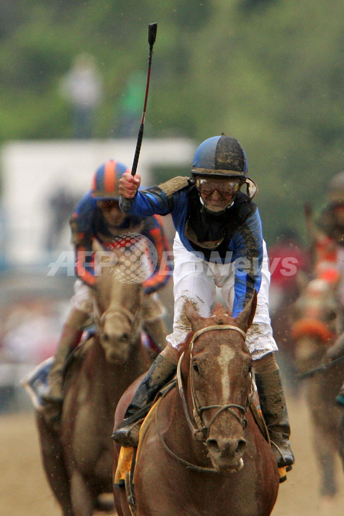 【ボルティモア/米国 19日 AFP】競馬、第132回プリークネス・ステークス(132nd Preakness Stakes)。ロビー・アルバラード(Robby Albarado)騎手が騎乗するカーリン(Curlin)は、2着のストリートセンス(Street Sense)にアタマ差をつけ1分53秒46で優勝を飾った。3着にはハードスパン(Hard Spun)が入った。