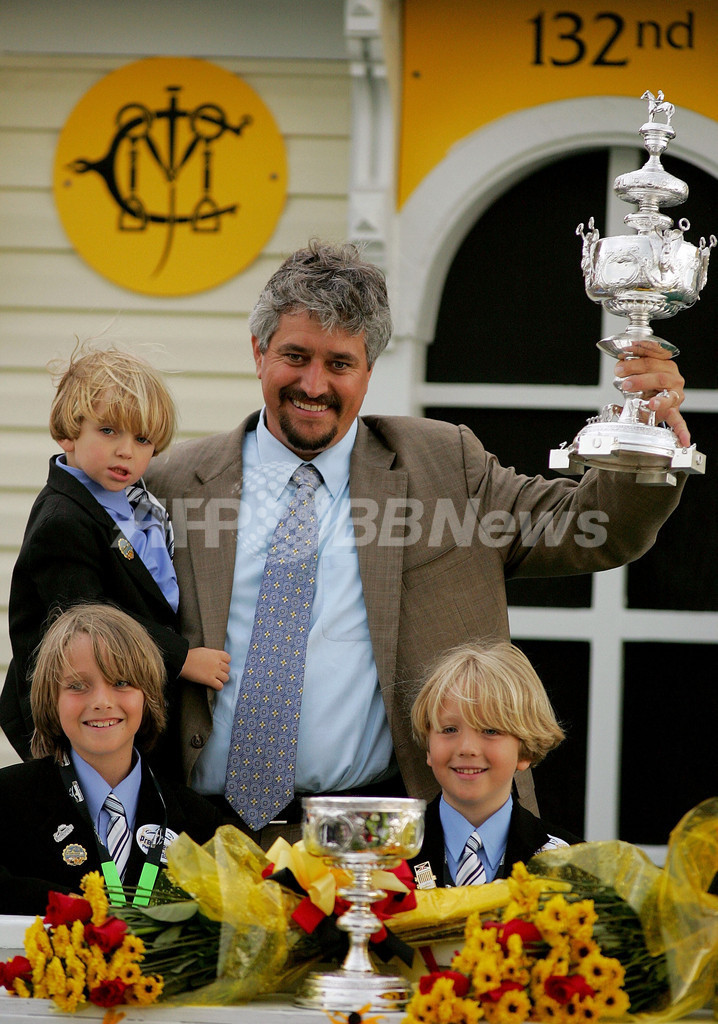 写真は、優勝トロフィーを掲げるアルバラード騎手(右)とスティーヴ・アスムッセン(Steve Asmussen)調教師。(c)AFP/Getty Images Matthew Stockman