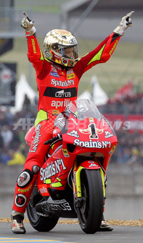 【ル・マン/フランス 20日 AFP】世界ロードレース選手権(WGP)・第5戦・フランスGP、250ccクラス、決勝。ポールポジションからスタートしたフォルトゥナ・アプリリア(Fortuna Aprilia)のホルヘ・ロレンゾ(Jorge Lorenzo)は、43分12秒237をマークして今季4勝目をポール・トゥ・ウィンで飾った。写真は、レースを終え優勝をアピールするロレンゾ。(c)AFP/ANDRE DURAND