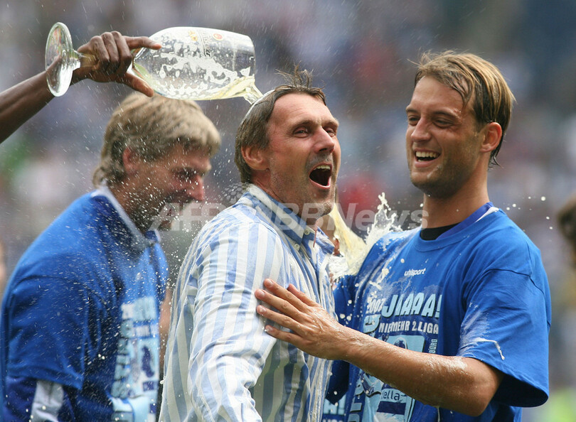 【デュイスブルク/ドイツ 21日 AFP】サッカー、ドイツ・ブンデスリーガ2部・最終第34節、デュイスブルク(Duisburg)vsロートヴァイス・エッセン(Rot-Weiss Essen)。試合はデュイスブルクが3-0でロートヴァイス・エッセンを降し、勝ち点60の3位で今季のリーグ戦を終え、2季ぶりの1部昇格を果たした。写真は、1部復帰を決めて歓喜するデュイスブルクの選手たち。(c)AFP/PATRIK STOLLARZ