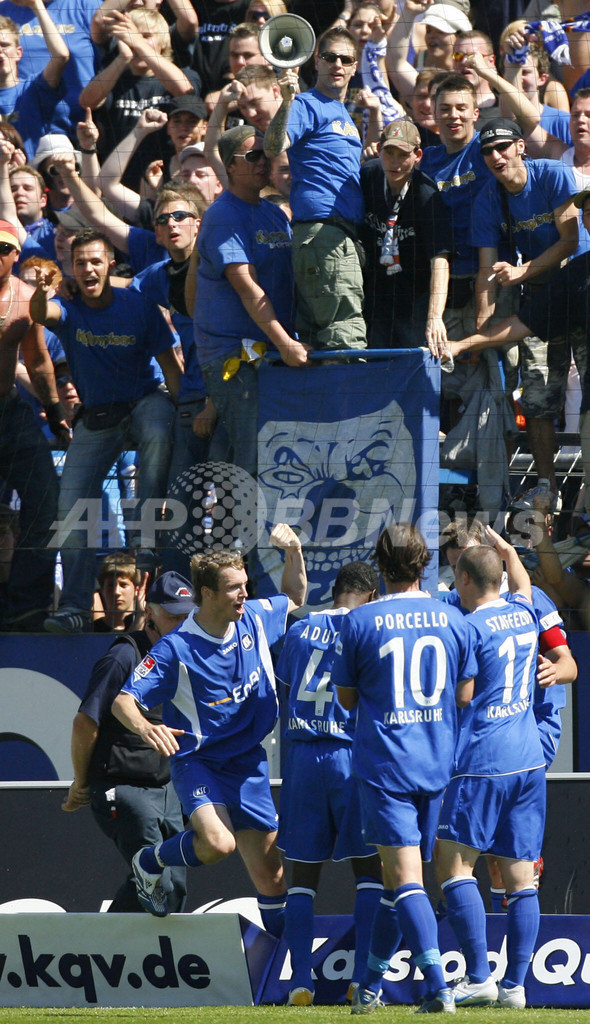 【フュルト/ドイツ 21日 AFP】サッカー、ドイツ・ブンデスリーガ2部・最終第34節、SpVggグロイター・フュルト(SpVgg Greuther Fuerth)vsカールスルーエSC(Karlsruher SC)。カールスルーエのジョヴァンニ・フェデリコ(Giovanni Federico)は、この試合でハットトリック(後半19分、21分、44分)を達成しチームを勝利に導く。試合は既に優勝を決め1部昇格を果たしているカールスルーエが3-1で勝利し、21勝6敗7分けでシーズンを終えた。(c)AFP/DDP/TIMM SCHAMBERGER