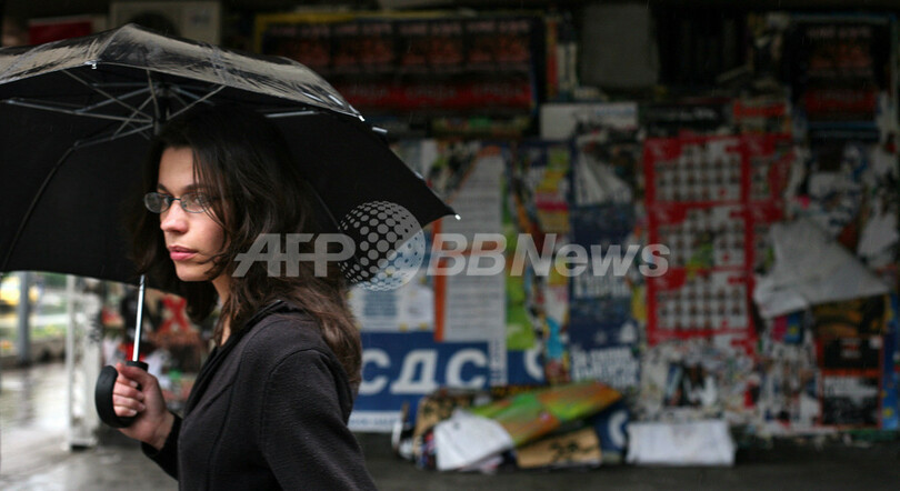 【ソフィア/ブルガリア 20日 AFP】ブルガリアで20日、初の欧州議会議員を選出する選挙の投票が実施された。初めて行われた非公式出口調査によると、汚職事件で欧州連合(European Union、EU)の厳しい調査を受けているものの、与党社会党が勝利することは間違いないとみられている。写真は20日、ソフィア(Sofia)の中心街にはられた選挙ポスターと、その前を通り過ぎる女性。(c)AFP/BORYANA KATSAROVA