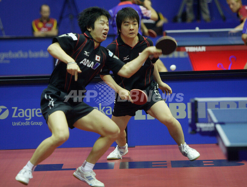 【5月25日 AFP】2007世界卓球選手権(2007 World Table Tennis Championships)、男子ダブルス3回戦。日本の岸川聖也(Seiya Kishikawa)/水谷隼(Jun Mizutani)組は、中国のHao Shuai/マ・ロン(Ma Long)組と対戦。岸川/水谷組はセットカウント4-1(11-8、6-11、11-2、11-9、11-8)でShuai/マ・ロン組を降し、準々決勝進出を決めた。(c)AFP