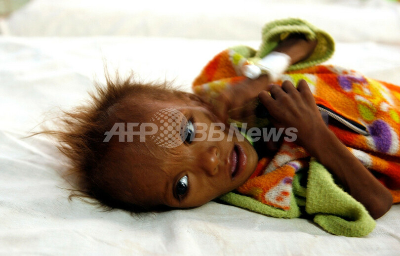 【5月26日 AFP】生後18か月のNitishちゃんは母親の腕に抱かれ、だるそうな様子で周囲をじっと見る。その体は干からびたようにやせ細っている。中部マディヤプラデシュ(Madhya Pradesh)州%%