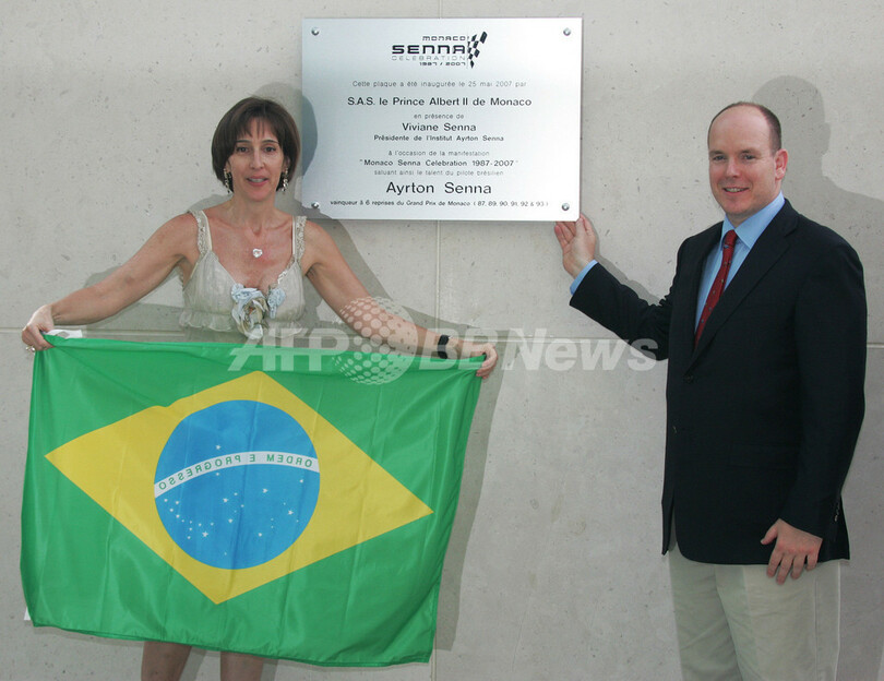 【5月26日 AFP】F1第5戦・モナコGP(Monaco Grand Prix 2007)開催中のモナコで、元F1ワールドチャンピオンの故アイルトン・セナ(Ayrton Senna)氏のモナコGP初勝利20周年を記念したプレートの除幕式が行われ、セナ氏の姉のビビアーヌ(Viviane)さんと甥のブルーノ・セナ(Bruno Senna)氏がモナコのアルバート王子(Prince Albert)と共に除幕に立ち会った。(c)AFP/BERTRAND GUAY