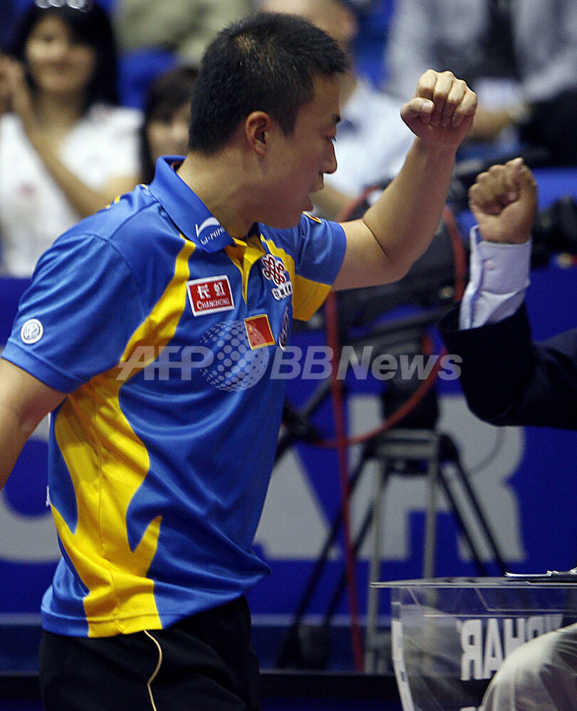 【5月27日 AFP】2007世界卓球選手権(2007 World Table Tennis Championships)、男子ダブルス決勝。中国のチェン・チー(Qi Chen)/マ・リン(Ma Lin)組は、同じく中国のワン・ハオ(Wang Hao)/ワン・リチン(Liqin Wang)組と対戦。チェン・チー/マ・リン組はセットカウント4-2(6-11、11-7、6-11、11-3、11-9、11-9)でワン・ハオ/ワン・リチン組を降し、優勝を果たした。(c)AFP
