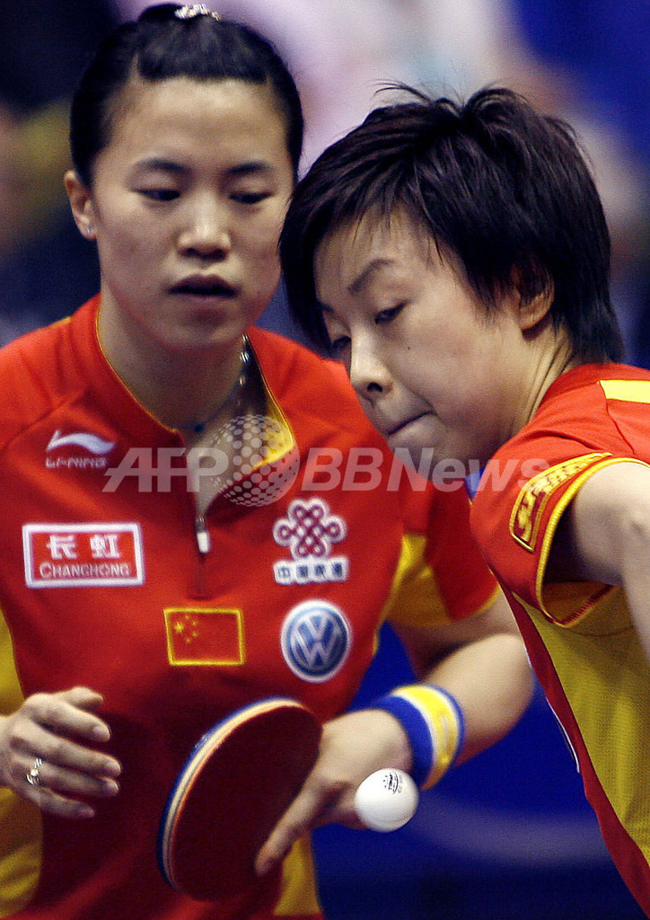 【5月28日 AFP】2007世界卓球選手権(2007 World Table Tennis Championships)、女子ダブルス決勝。中国のワン・ナン(Wang Nan)/ツァン・イーニン(Zhang Yining)組は、同じ中国のリー・シャオシァ(Li Xiaoxia)/グオ・ユエ(Guo Yue)組と対戦。ワン・ナン/ツァン・イーニン組は4-0(11-5、11-6、13-11、11-9)のストレートでリー・シャオシァ/グオ・ユエ組を降し、大会連覇を達成した。(c)AFP