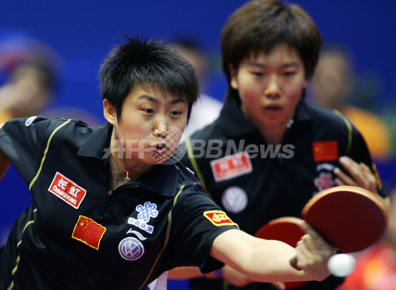 【5月28日 AFP】2007世界卓球選手権(2007 World Table Tennis Championships)、女子ダブルス決勝。中国のワン・ナン(Wang Nan)/ツァン・イーニン(Zhang Yining)組は、同じ中国のリー・シャオシァ(Li Xiaoxia)/グオ・ユエ(Guo Yue)組と対戦。ワン・ナン/ツァン・イーニン組は4-0(11-5、11-6、13-11、11-9)のストレートでリー・シャオシァ/グオ・ユエ組を降し、大会連覇を達成した。(c)AFP