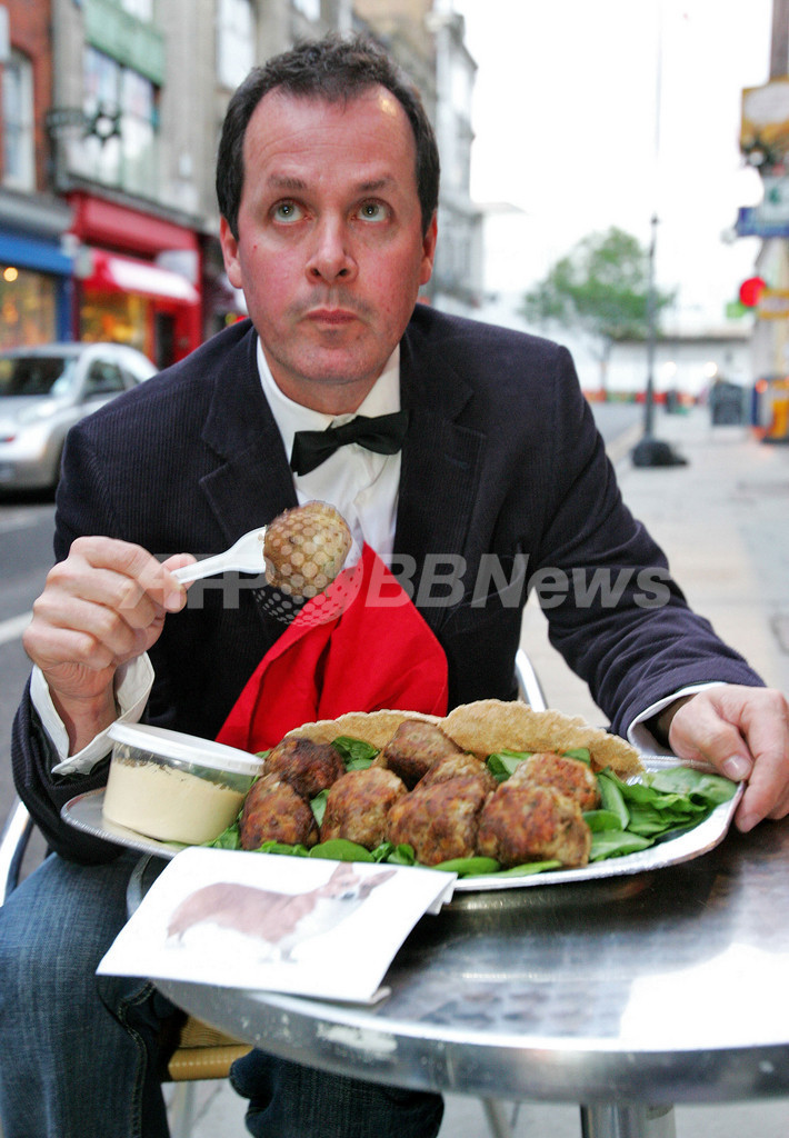 【5月30日 AFP】英国人アーティストのマーク・マッゴーワン(Mark McGowan)さんが29日、ロンドンの街中で「コーギー犬の肉料理」を食べる抗議パフォーマンスを行った。