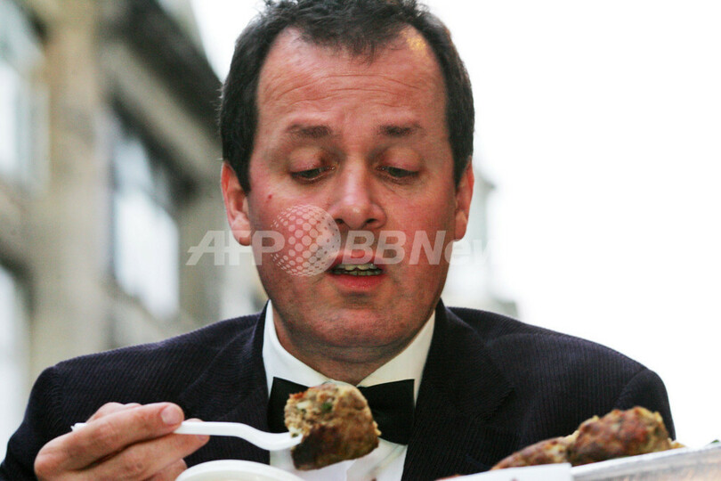 【5月30日 AFP】英国人アーティストのマーク・マッゴーワン(Mark McGowan)さんが29日、ロンドンの街中で「コーギー犬の肉料理」を食べる抗議パフォーマンスを行った。