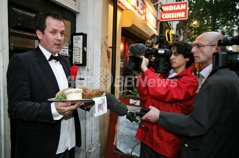 【5月30日 AFP】英国人アーティストのマーク・マッゴーワン(Mark McGowan)さんが29日、ロンドンの街中で「コーギー犬の肉料理」を食べる抗議パフォーマンスを行った。
