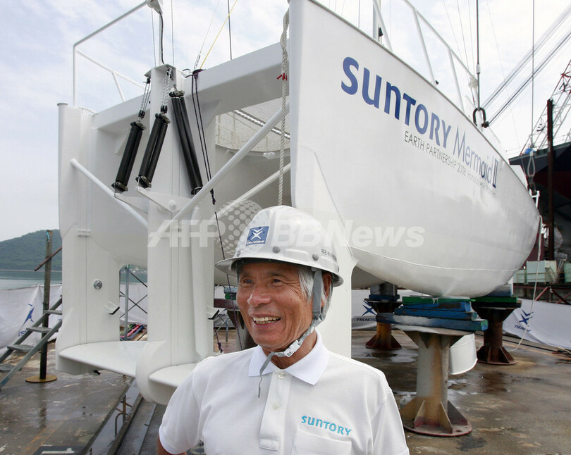 【5月31日 AFP】海洋冒険家の堀江謙一さん(68)が世界初の「波の力だけによる」単独航海で使う新型船「SuntoryマーメイドII号(Suntory Mermaid II)」が完成し、広島県福山市の常石造船所で30日、進水式があった。