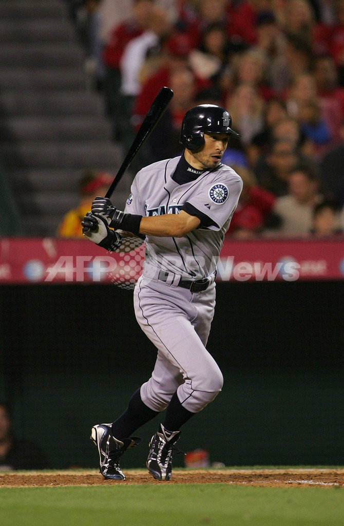 【5月31日 AFP】07MLB、ロサンゼルス・エンゼルス・オブ・アナハイム(Los Angeles Angels of Anaheim)vsシアトル・マリナーズ(Seattle Mariners)。1番・中堅で先発出場したマリナーズのイチロー(Ichiro)は4回表の第3打席に右前安打を放ち、5打数1安打1打点の活躍で、自己最長に並ぶ23試合連続安打を記録した。試合はマリナーズが6-8でエンゼルスに敗れ、2連敗を喫した。(c)AFP/Getty Images