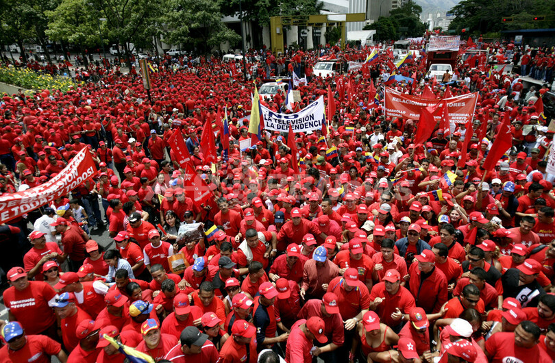 同日デモに参加したのは、チャベス大統領の政策により恩恵を受ける公務員や会社員。落下傘降下兵時代に同大統領が着用していたベレー帽の色にちなんで赤いTシャツと帽子を着用し、「テレビとラジオの民主化」をスローガンに掲げた。行進する数千人の支持者は「チャベスは去らない!」と声を張り上げ、トラックやバスに積まれた拡声器からは、大統領を支持するメッセージが流された。
