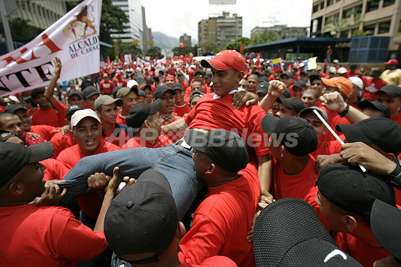【6月3日 AFP】ウゴ・チャベス(Hugo Chavez)大統領が自身に批判的な民放テレビ局「RCTV」を放送停止に追い込んだことに対する非難が高まる中、大統領支持者が2日、首都カラカス(Caracas)で、チャベス大統領への支持を訴えるデモ行進を行った。