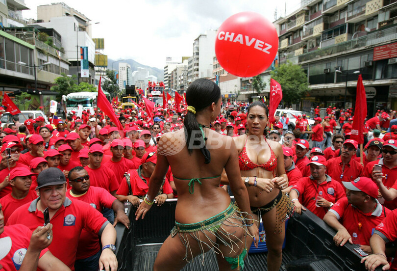 同日デモに参加したのは、チャベス大統領の政策により恩恵を受ける公務員や会社員。落下傘降下兵時代に同大統領が着用していたベレー帽の色にちなんで赤いTシャツと帽子を着用し、「テレビとラジオの民主化」をスローガンに掲げた。行進する数千人の支持者は「チャベスは去らない!」と声を張り上げ、トラックやバスに積まれた拡声器からは、大統領を支持するメッセージが流された。