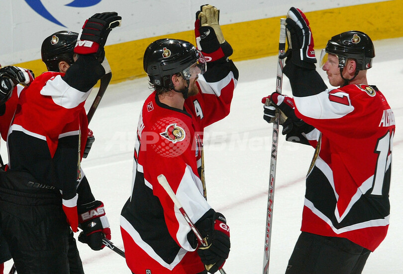 スポーツ ウインタースポーツ セネターズ ダックスに勝利し対戦成績1勝2敗に 2007年6月3日 19:28 発信地:オタワ/カナダ [ 北米 カナダ ] このニュースをシェア ‹ › ❮ 8/14 ❯ 試合後に勝利に歓喜するセネターズの選手たち。(c)AFP/Getty Images Jim McIsaac 画像作成中 ! 【6月3日 AFP】06-07NHL、スタンレー杯(Stanley Cup 2007)、オタワ・セネターズ(Ottawa Senators)vsアナハイム・ダックス(Anaheim Ducks)、第3戦。試合は第2ピリオドに逆転したセネターズが5-3でダックスを降し、対戦成績を1勝2敗とした。(c)AFP/Getty Images ウインタースポーツ 一覧へ> メディア・報道関係・法人の方向け 写真・動画 購入のお問合せ>