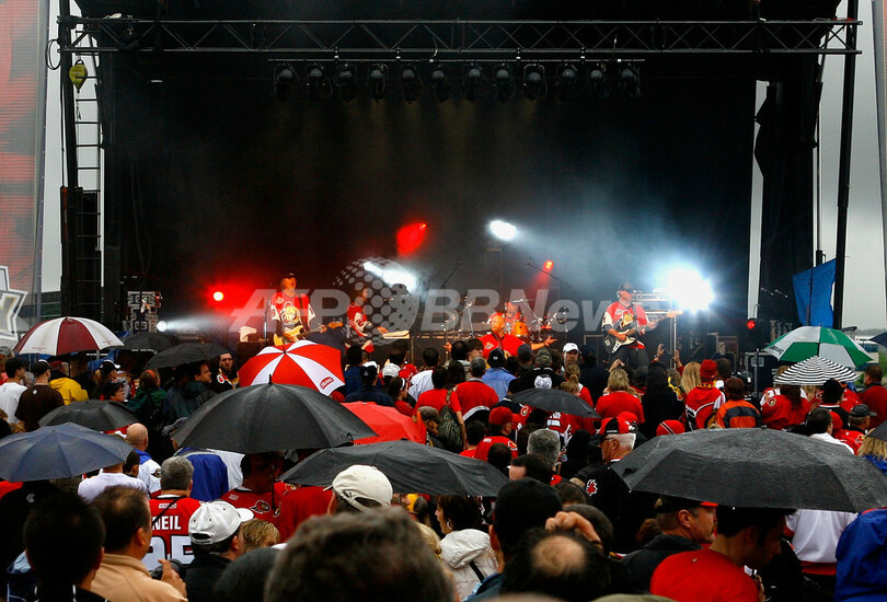 【6月5日 AFP】06-07NHL、スタンレー杯(Stanley Cup 2007)、オタワ・セネターズ(Ottawa Senators)vsアナハイム・ダックス(Anaheim Ducks)、第4戦。試合前にはロックバンドのトゥルーパー(Trooper)が会場の外に姿を現わし、野外ライブを披露した。試合は2-2で迎えた第3ピリオドに決勝点となるゴールを挙げたダックスが3-2でセネターズを降し、対戦成績3勝1敗でスタンレー杯優勝に王手を掛けた。(c)AFP/Getty Images