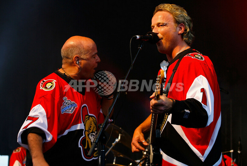 【6月5日 AFP】06-07NHL、スタンレー杯(Stanley Cup 2007)、オタワ・セネターズ(Ottawa Senators)vsアナハイム・ダックス(Anaheim Ducks)、第4戦。試合前にはロックバンドのトゥルーパー(Trooper)が会場の外に姿を現わし、野外ライブを披露した。試合は2-2で迎えた第3ピリオドに決勝点となるゴールを挙げたダックスが3-2でセネターズを降し、対戦成績3勝1敗でスタンレー杯優勝に王手を掛けた。(c)AFP/Getty Images