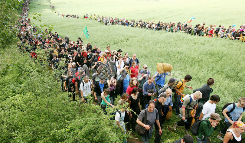 ピエロや色とりどりのかつらを付け、グローバリゼーションや戦争に反対する人々がサミット会場を囲む長さ12キロのフェンス沿いに集まった。参加者数はデモの主催者側の発表では1万人以上だが、警察の発表では9000人となっている。