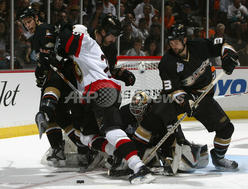 セネターズは、1-2とダックスを追う展開の第2ピリオドにクリス・フィリプス(Chris Phillips)のキープしたパックをゴーリーのレイ・エメリー(Ray Emery)がキックしてしまい、ゴールに入るという不運なミスでダックスにリードを広げられてしまった。このプレーは、神経質で元気のないプレーが続出したセネターズの戦い振りを象徴するような形だった。結果、得点はそのプレイの直前までパックに触っていたダックスの最後の選手だった、モエンのゴールと認められた。