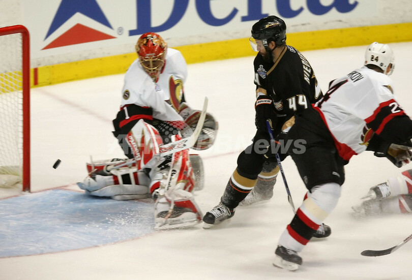 セネターズは、1-2とダックスを追う展開の第2ピリオドにクリス・フィリプス(Chris Phillips)のキープしたパックをゴーリーのレイ・エメリー(Ray Emery)がキックしてしまい、ゴールに入るという不運なミスでダックスにリードを広げられてしまった。このプレーは、神経質で元気のないプレーが続出したセネターズの戦い振りを象徴するような形だった。結果、得点はそのプレイの直前までパックに触っていたダックスの最後の選手だった、モエンのゴールと認められた。